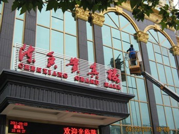 迪幫保潔公司人員正在為“陳香賓館”做外墻清洗、玻璃清洗。